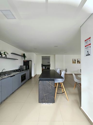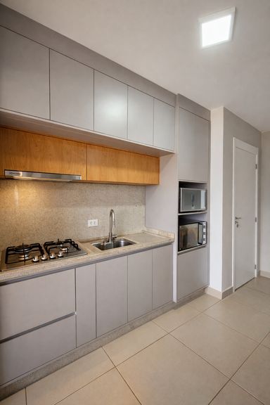 A cozinha planejada já está equipada com móveis sob medida e integrada ao ambiente social, trazendo praticidade ao dia a dia.
