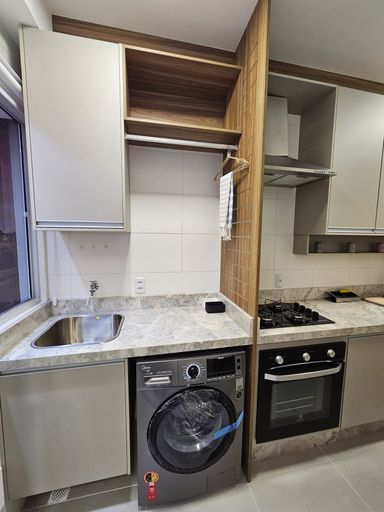 Revestimento cerâmico até o teto na área de serviço, cozinha e banheiro.