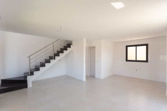 A área social é um dos pontos altos do sobrado. A sala é ampla e muito bem iluminada, integrada à cozinha para criar uma sensação maior de amplitude e convivência. A escada em granito, combinada ao pé direito duplo e vidro do chão ao teto, traz um visual imponente, favorece a entrada de luz natural e valoriza ainda mais o ambiente.